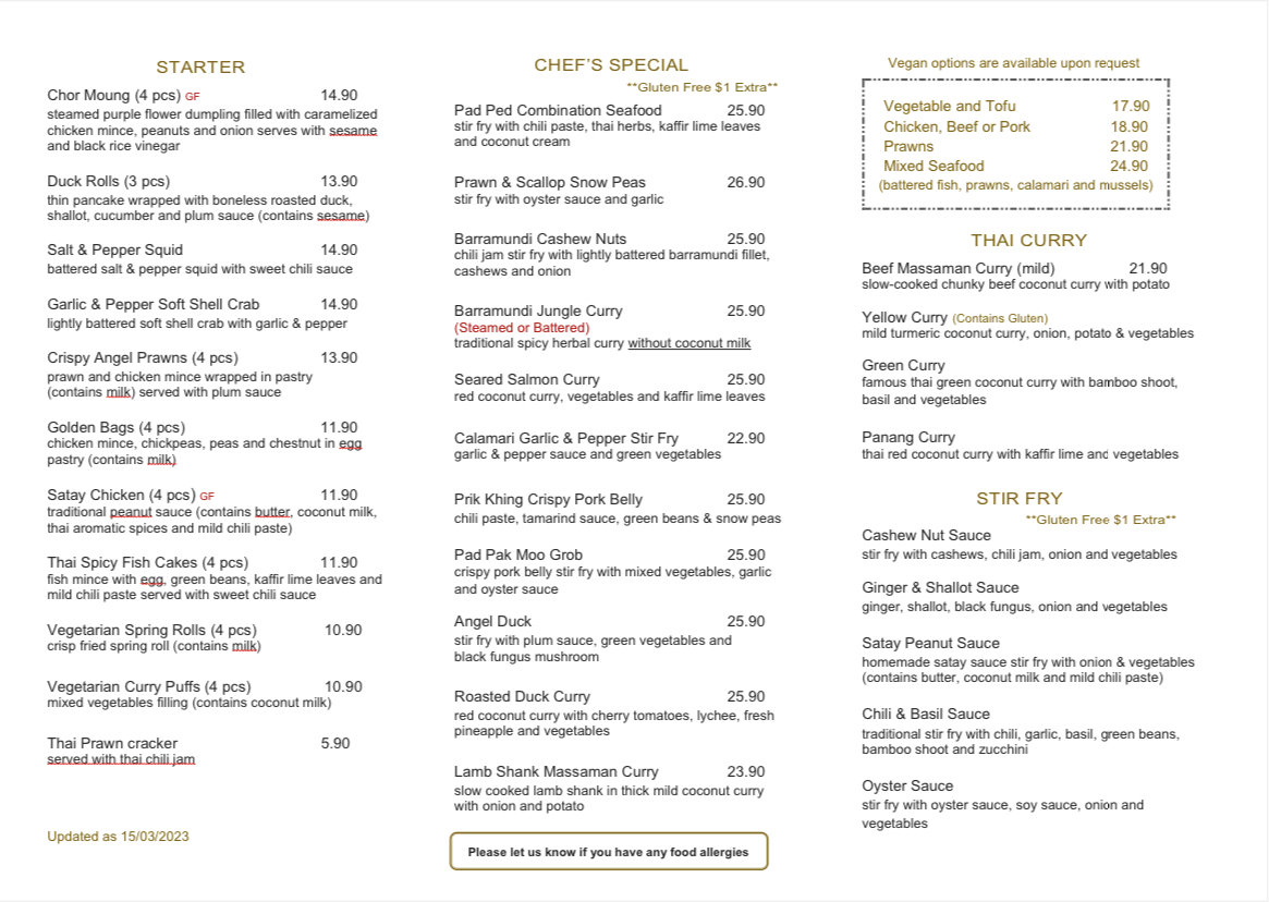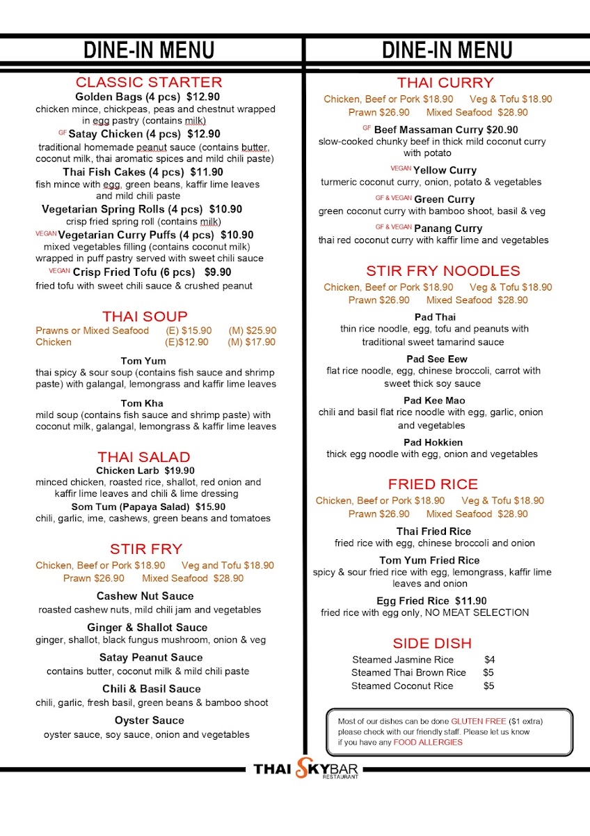 The menu at Thai SkyBar Restaurant offers a thoughtfully curated selection of traditional Thai dishes, presented with a modern touch. It’s the kind of menu that invites you to explore familiar flavors as well as unique creations, making it well-suited to both relaxed dinners and special occasions.