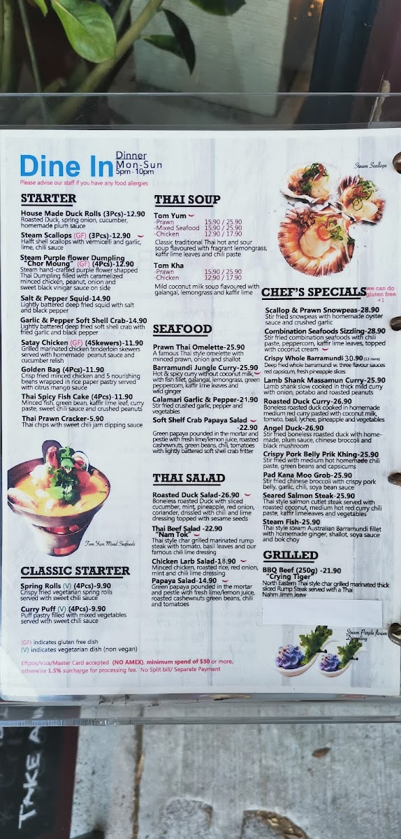 You’ll find a range of dishes that work well for sharing or savoring solo. Whether enjoying hand-carved butterfly pea dumplings filled with fragrant chicken and fresh herbs, crisp fried tofu, or the vibrant soft shell crab papaya salad, the flavors are layered and balanced. Heartier options like grilled chicken or pad ped combination seafood bring warmth and satisfying complexity, fitting seamlessly with the welcoming atmosphere.